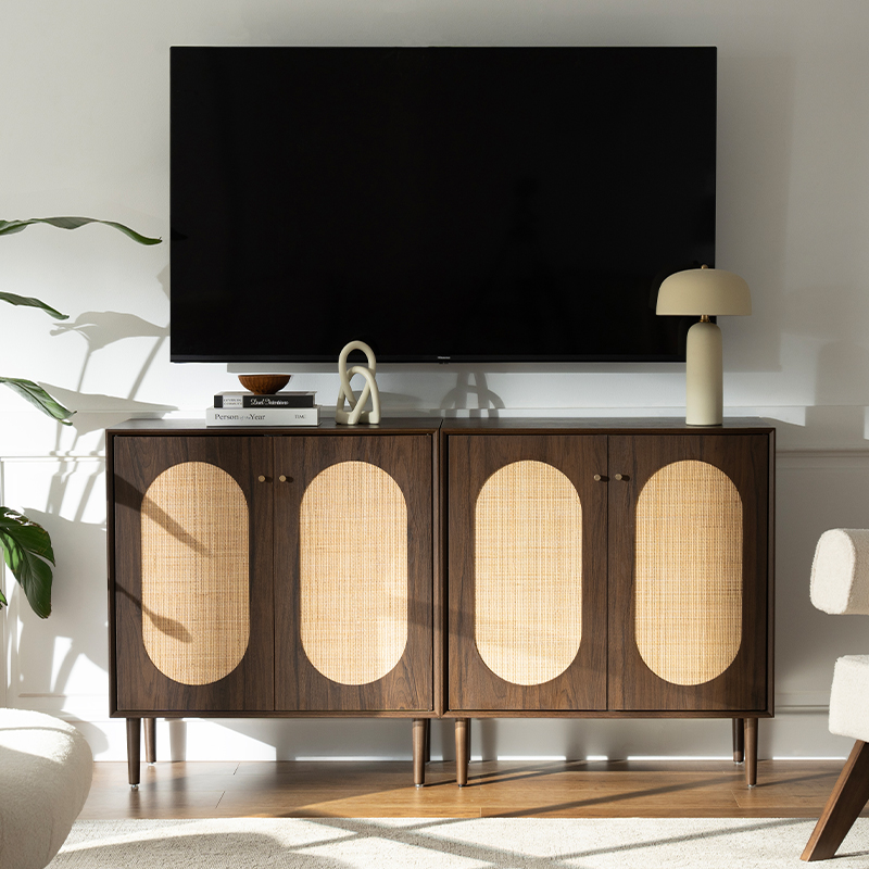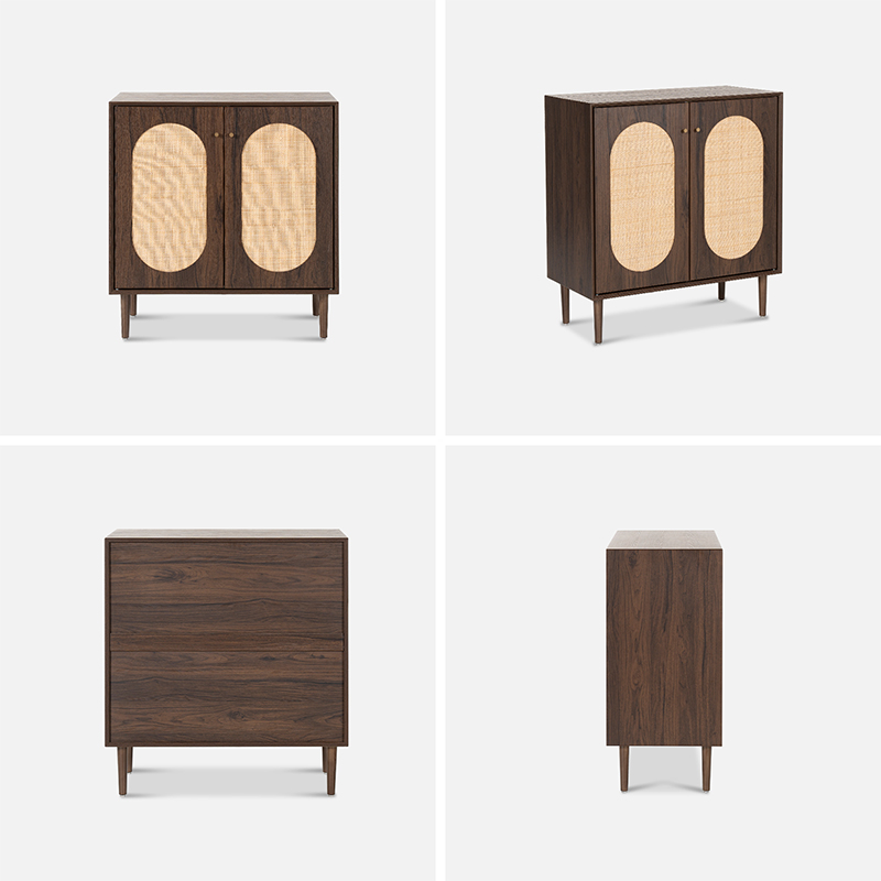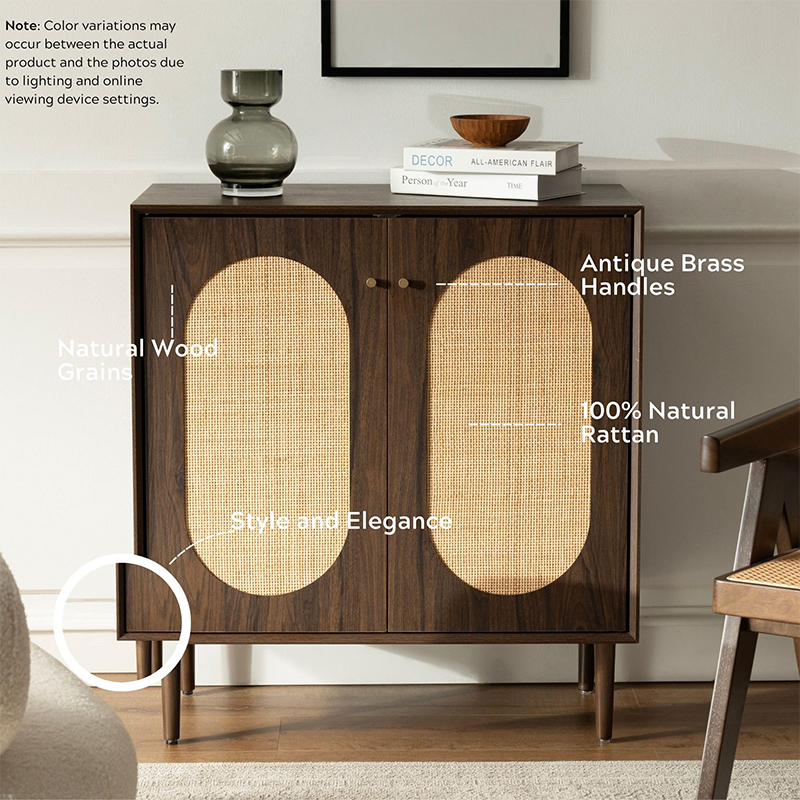 Um dos principais benefícios deste gabinete é a sua funcionalidade. Com duas portas que se abrem para revelar um interior espaçoso, este armário é ideal para guardar uma grande variedade de itens, incluindo livros, roupas e utensílios domésticos. Além disso, os detalhes em rattan nas portas oferecem um toque único e elegante que complementará qualquer decoração.