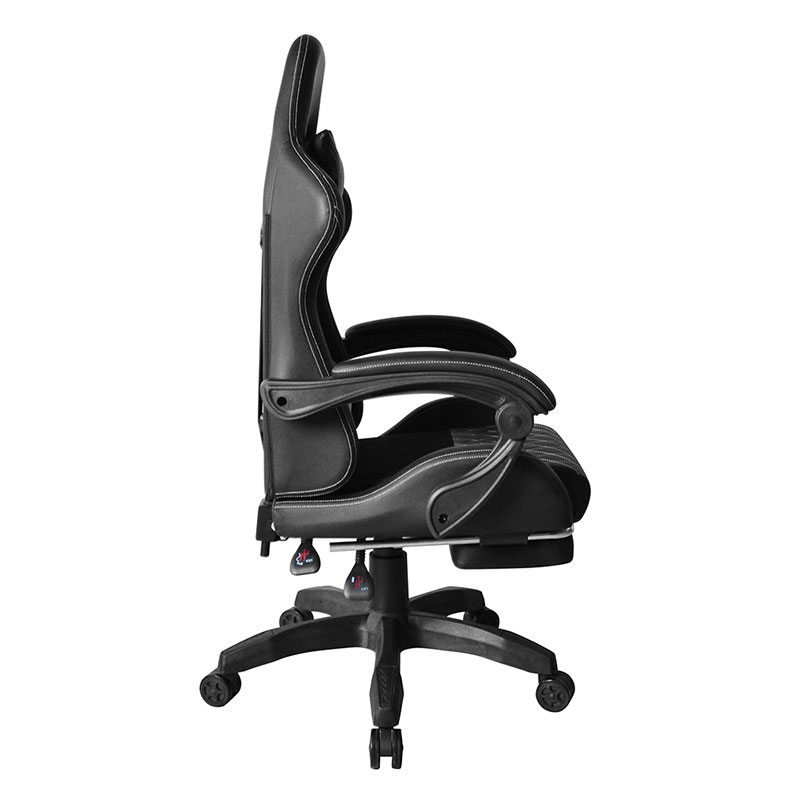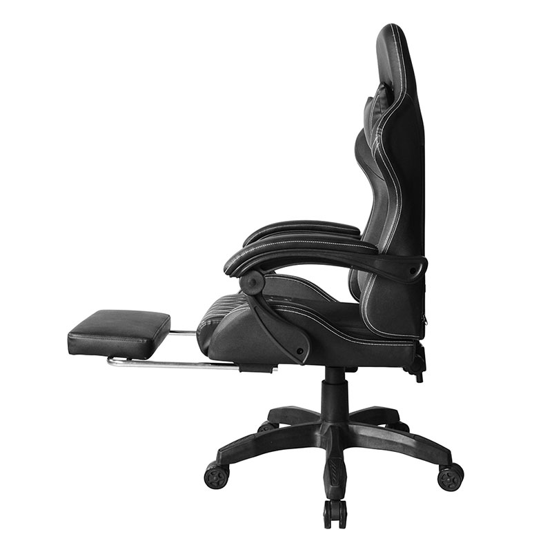 | Materiais | PVC Apoio de braço ajustável em PP Mecanismo reclinável Elevador a gás classe 3 de 100 mm Base de náilon de 320mm Rodízios de cor PU de 50 mm Com travesseiro de pescoço e travesseiro de cintura Caixa: 250 libras Com apoio para os pés Com luz RGB |