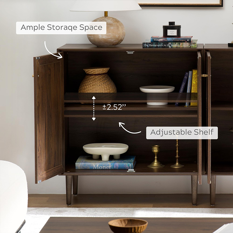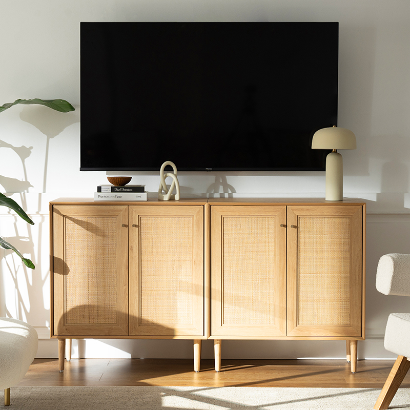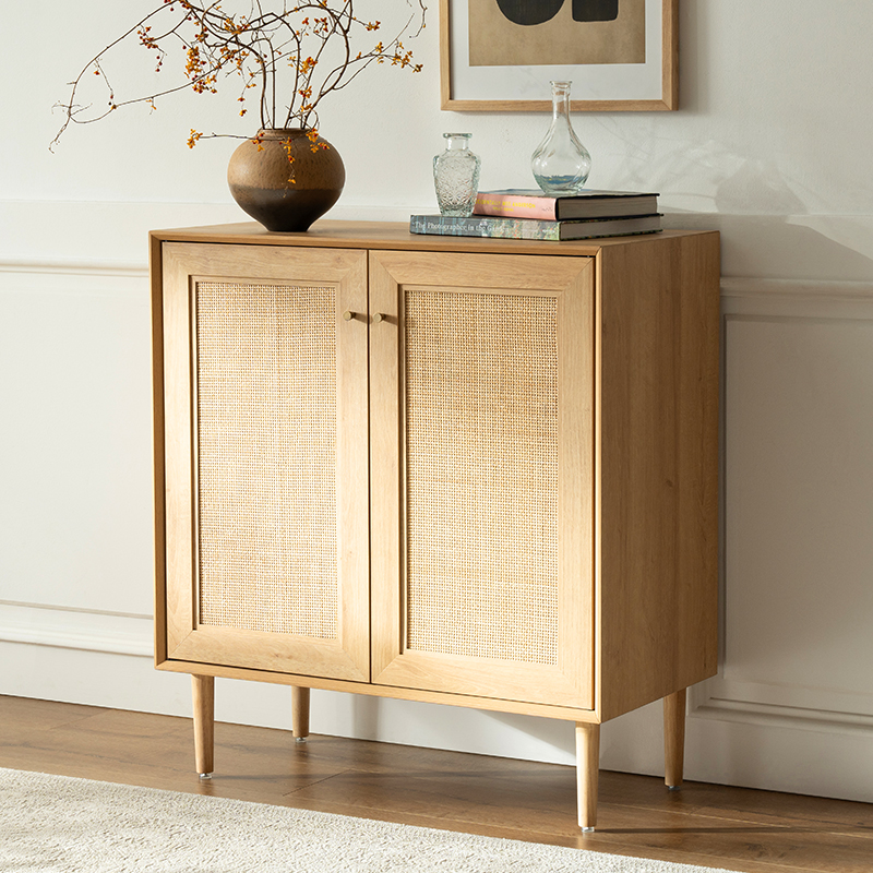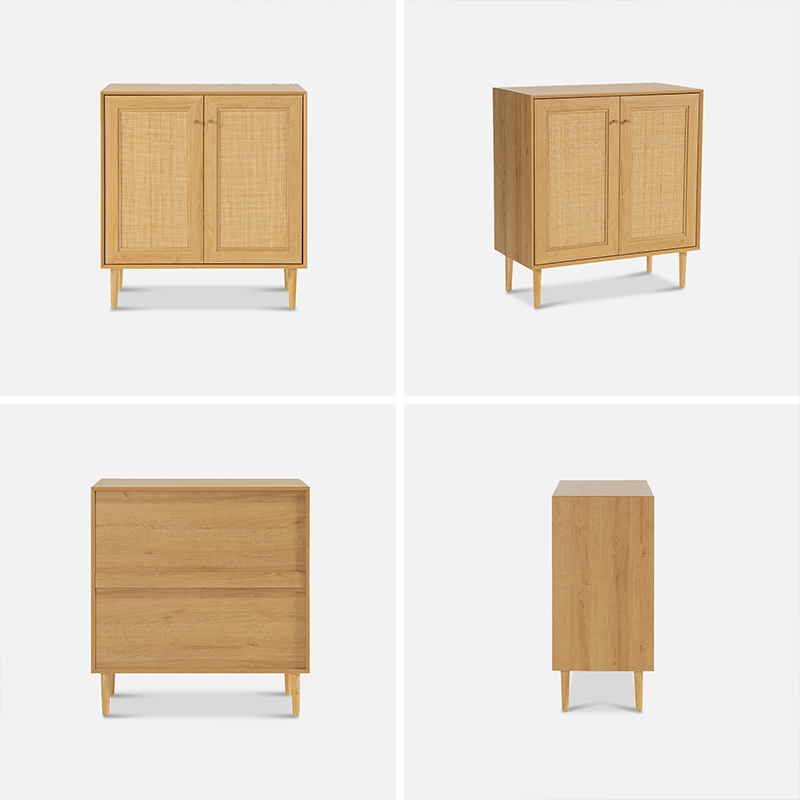 | Tábua de madeira maciça com acabamento em MDF e acabamento em rattan verdadeiro | |