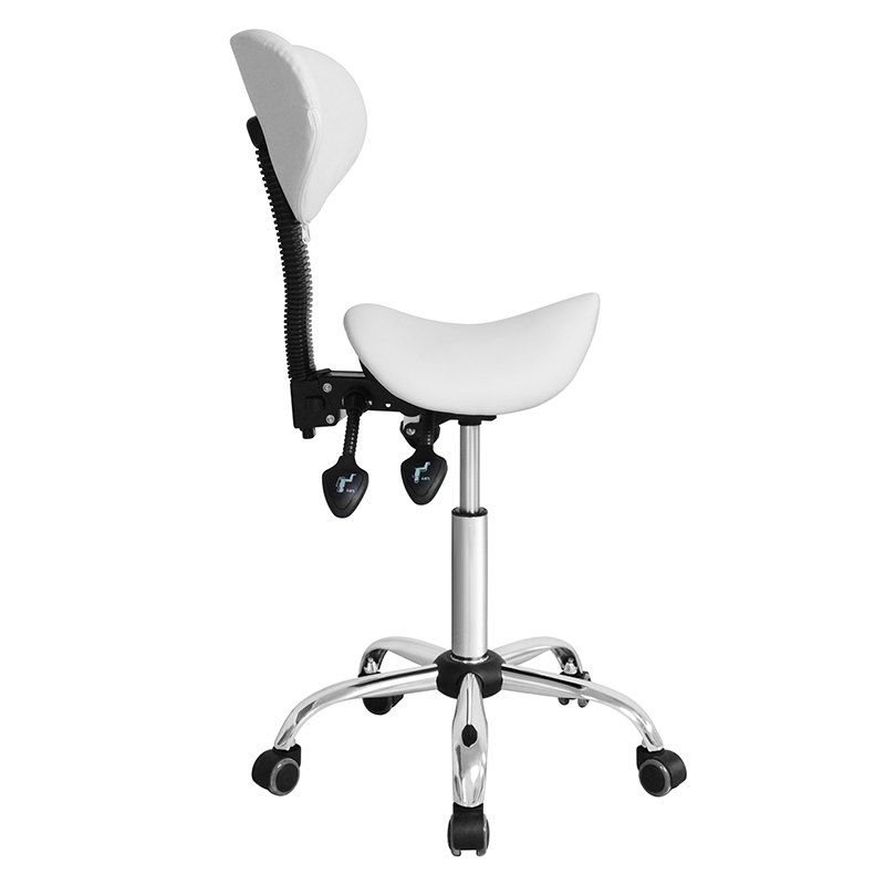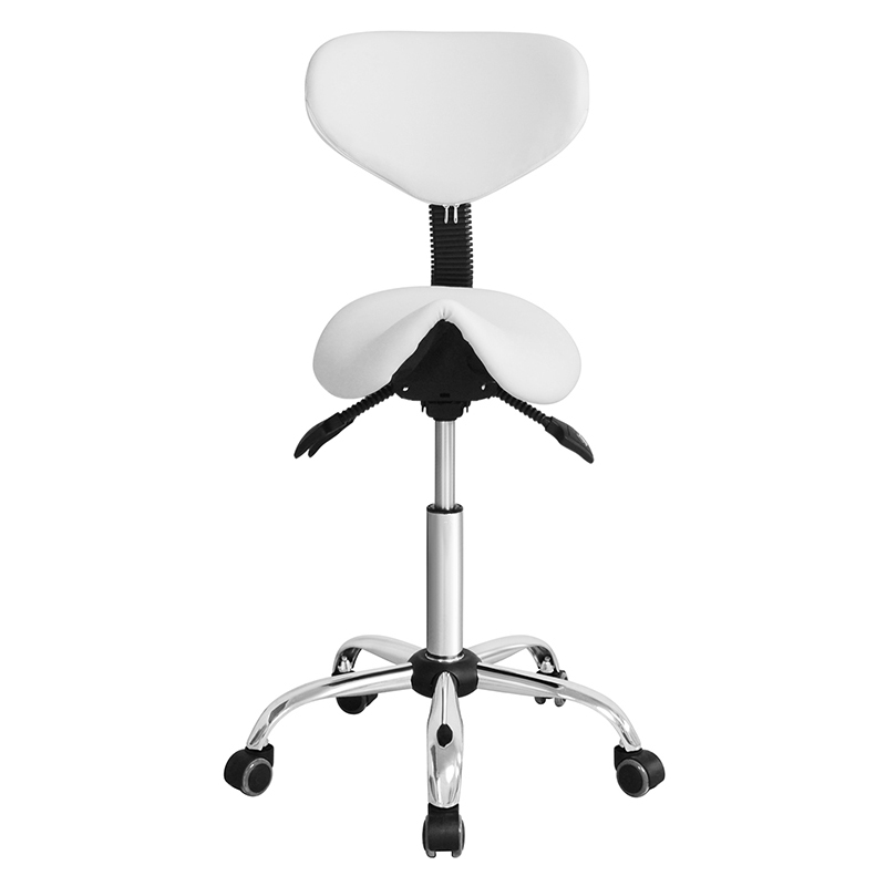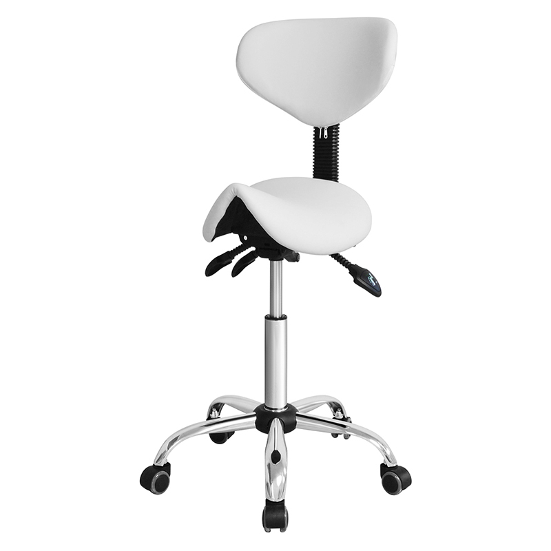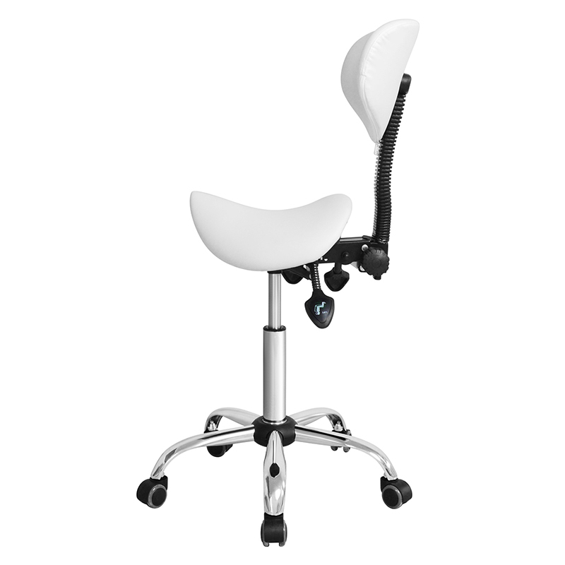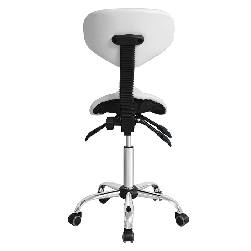 A cadeira possui um encosto central ergonomicamente projetado para oferecer suporte consistente às costas, ombros e pescoço. O formato da sela permite que o usuário se sente na cadeira com postura, evitando qualquer esforço ou desconforto.